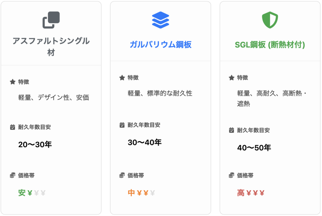 屋根カバー工法の費用を左右する最大の要因の一つが、新しい屋根材の種類です。特に軽量でカバー工法に適した主要な屋根材は、性能と価格帯が大きく異なります。