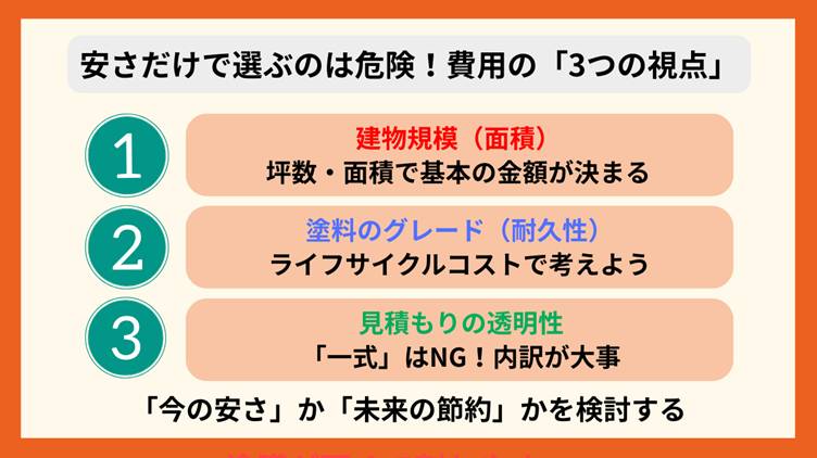 「1回の工事費」だけでなく、「次の塗り替えまでの期間(ライフサイクルコスト)」を考えて選ぶのが賢い方法です。