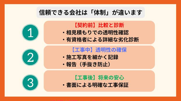 ・選び方:詳細な診断と見積もり、保証のある会社を選ぶ