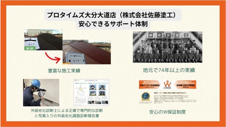 ご自身での判断が難しい場合は、専門家による診断をおすすめします。株式会社佐藤塗工(プロタイムズ大分大道店) では、専門資格を持つスタッフが建物の状態を詳しく調査し、最適な時期をご案内します。
