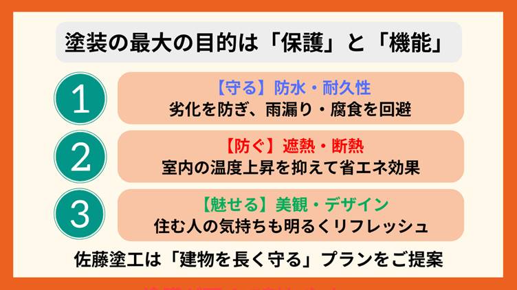 まずは、「なぜ塗装を行なう必要があるのか」という目的と効果を整理しましょう。住宅塗装には、大きく分けて4つのメリットがあります。