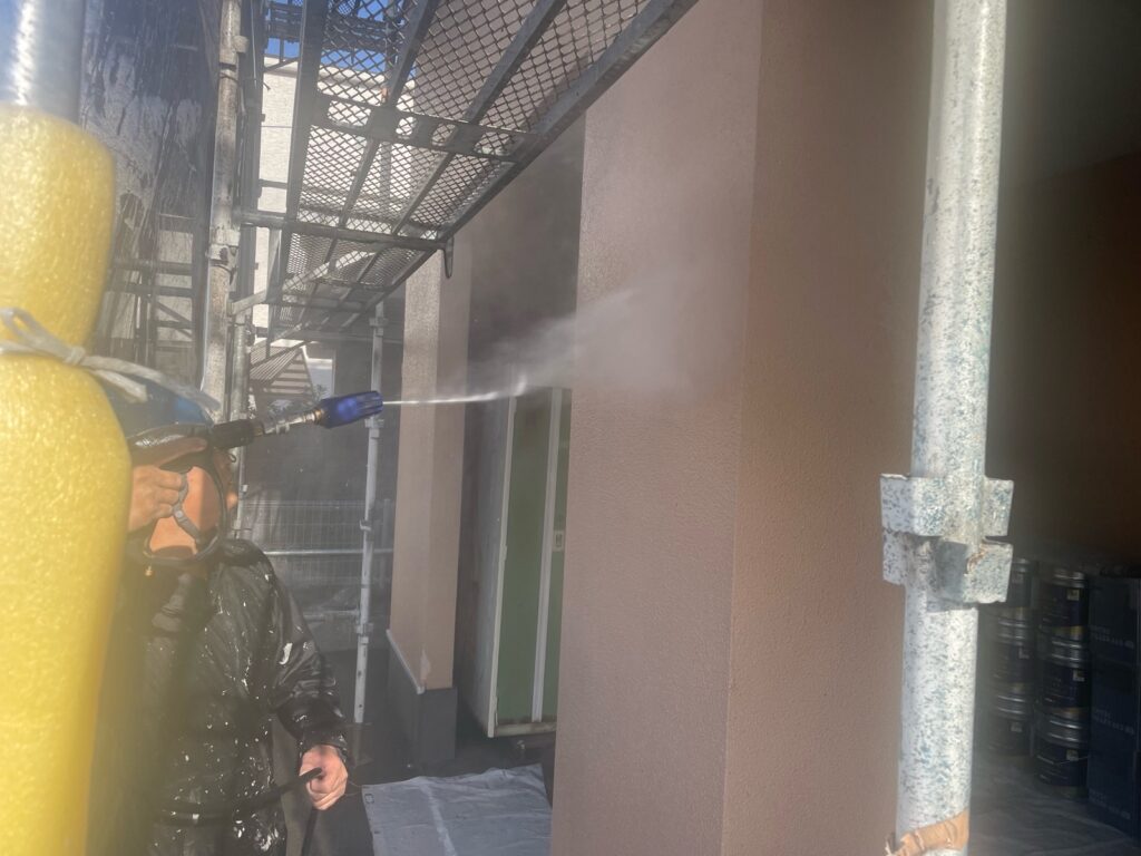 塗料の密着を高めるためにとても大事なのが高圧洗浄です。もし、汚れが残ったまま塗装してしまうと、数年で塗料が剥げてしまうなどの不具合が発生するリスクが上がります。
